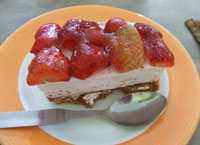 風味や舌触りを損なうことなく、ピュアベジタリアン向けのチーズケーキを作ることに成功しました。ブルーベリー又は(季節により)ストロベリーのトッピングをしています。
